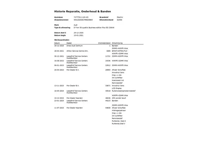 Topprestaties zonder emissies: de Audi e-tron is een elektrische auto zonder compromissen. De actieradius van deze auto is met 308 kilometer ruim voldoende voor de meeste dagelijkse ritten. De lithium-ion accu heeft een capaciteit van 11 kWh en is binnen 6 uur opgeladen. Een krachtige motor geeft deze auto zijn sportieve prestaties. Het lederen interieur geeft een puur luxegevoel. En ook aan optimaal gemak is gedacht: een elektrisch bediende glazen panorama dak en de elektrisch bedienbare achterklep. Is dat niet compleet? Stoelverwarming maakt het leven in deze auto aangenaam op koude en winterse dagen. Ook op de minder vlakke wegen zoeft u lekker door dankzij de luchtvering. Ook 20 inch lichtmetalen velgen, LED koplampen, adaptief dempingsysteem, donker getint glas achter, LED-achterlichten en verstelbare lendensteunen horen tot de voorzieningen op deze auto.