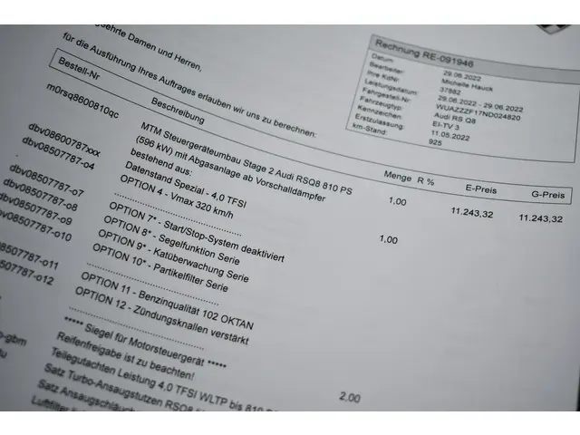 Full options? Jazeker! Deze RSQ8 heeft echt alles: Dynamic Plus pakket (keramische remmen, sportdif en actieve rolstabilisatie), panoramadak, B&O high-end, RS zetels met massage en ventilatie, alcantara hemel, adaptieve cruise, soft-close, head-up display, 23 inch wielen, standkachel, elektrische trekhaak en klasse 4 alarm reeds ingebouwd! Vandaar de nieuwprijs van eur. 309.000! Compleet zwart en in zeer nette staat. Daarnaast nog een MTM stage 2 pakket twv 16000,- met aanpaste uitlaat, 810pk en verlaging op de luchtvering. UNIEK!Meer informatie
