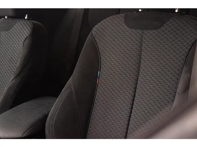 Van binnen een zwart alcantara/stof sport interieur met een zwart kleurige hemelbekleding en glans-zwarte interieur sierlijsten. Achterin een deelbare achterbank met ISO-fix aansluitingen.