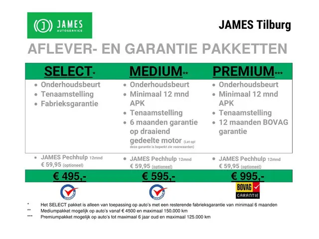 Voor meer informatie kun je bellen of een WhatsApp-bericht sturen naar 013 590 2432. Wij zijn bereikbaar van maandag t/m vrijdag tot 22:00 uur en op zaterdag van 10:00 tot 16:30 uur. Wij helpen u graag verder.JAMES Autoservice Tilburg is al meer dan 35 jaar een begrip in Tilburg en omgeving. Bezoek onze website www.jamestilburg.nl voor meer informatie over ons bedrijf, ons actuele aanbod, aanvullende foto’s en een 360° video van onze auto’s.