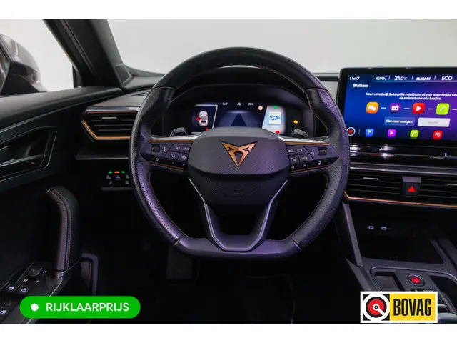 Ontspannen en zorgeloos autorijden, dat doet u met deze CUPRA Formentor. Deze auto komt uit het bouwjaar 2023. Onder de motorkap ligt een zuinige viercilinder benzinemotor. Voor het pittige uiterlijk én goed gesteund zitten zorgen de sportstoelen. Geen gekleum meer in de koude dagen. Het verwarmd stuurwiel voelt als een weldaad na het ijskrabben. Bij de zeer complete uitrusting van deze auto behoren ook 18 inch lichtmetalen velgen, Full LED koplampen, donker getint glas achter, in delen neerklapbare achterbank, LED-achterlichten en verstelbare lendensteunen.Via het digitale dashboard bent u permanent op de hoogte van alle informatie die u nodig heeft voor een veilige rit. U ziet geen paaltje meer over het hoofd dankzij de achteruitrijcamera. Met adaptive cruise control houdt de auto zelfstandig afstand tot uw voorligger. Een veiligheidsverhogende optie waarmee u comfortabel onderweg bent. Met uw smartphone maakt u overal contact met de auto. Remote services geven direct inzicht in uiteenlopende functies en zijn op afstand te activeren. Een belangrijke veiligheidsvoorziening is de bediening van het audio-installatiesysteem en het navigatiesysteem, via knoppen op het stuur en middels spraakbediening. DAB-ontvangst geeft daarbij een kraakheldere ontvangst. Deze CUPRA is voorzien van achteropkomend verkeer waarschuwing, automatische airconditioning, draadloos opladen, regensensor, keyless entry en automatisch dimmende binnenspiegel.