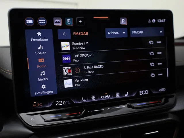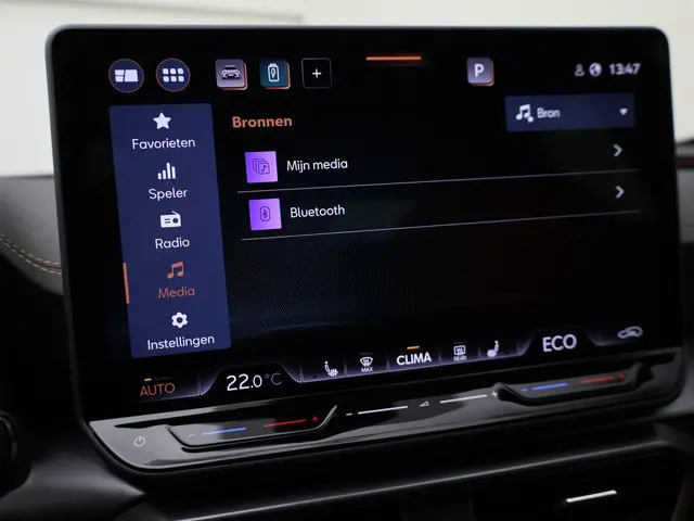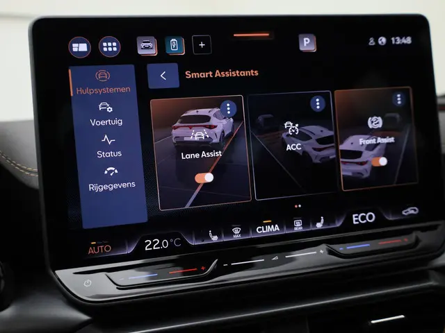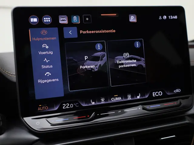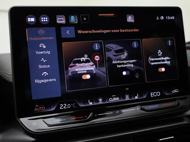 In deze auto zijn verschillende technologieën aanwezig die voor u het verkeer en de omgeving in de gaten houden en die desnoods ook kunnen remmen of bijsturen. Dat de auto steeds meer taken van de bestuurder overneemt, merkt u bijvoorbeeld aan het systeem voor verkeersbord-detectie in deze CUPRA. Indien u onbedoeld de rijstrook lijkt te verlaten, reageert het Lane-keeping systeem meteen en corrigeert. Het systeem van forward collision warning, of in gewoon Nederlands 'botswaarschuwing', treedt in werking als de sensor te weinig afstand signaleert met een voor- of tegenligger. De auto is ook uitgerust met front assist, hill hold functie, vermoeidheidsherkenning en bandenspanningcontrolesysteem.