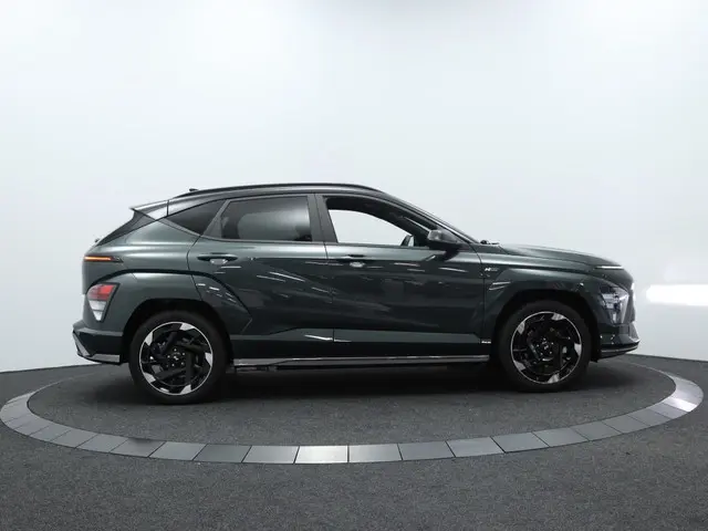 Wat het exterieur betreft, heeft deze Hyundai Kona Electric N Line Edit 5-spaaks lichtmetalen velgen van 19 inch die een sportieve en elegante uitstraling bieden. De metallic lak zorgt voor een verfijnde afwerking en geeft de auto een premium uitstraling.