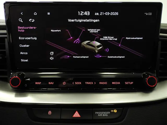Geavanceerde technische systemen houden tijdens elke rit het verkeer in de gaten en reageren op potentieel gevaarlijke situaties. Dat de auto steeds meer taken van de bestuurder overneemt, merkt u bijvoorbeeld aan het systeem voor verkeersbord-detectie in deze Kia. Het Lane-keeping systeem doet precies wat nodig is: waarschuwen en corrigeren bij onbedoelde overschrijding van de rijstrooklijnen. Forward collision warning waarschuwt bij een dreigende aanrijding en vermindert de gevolgen van een ongeval. U bent mede dankzij dodehoekdetectie, hill hold functie, vermoeidheidsherkenning, autonoom remsysteem en bandenspanningcontrolesysteem steeds veilig onderweg.