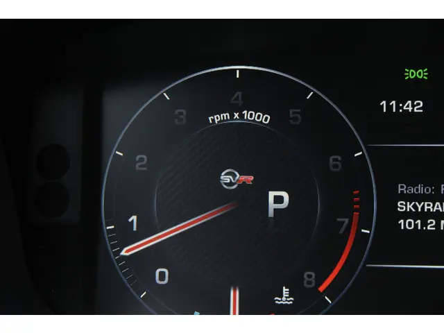 De carrosserie is uitgevoerd in het diep glanzende Santorini Black, een kleur die de krachtige lijnen van de SVR accentueert. De exterieuruitvoering is volledig 'blacked-out', inclusief de imposante 22 inch lichtmetalen velgen. Dit wordt enkel doorbroken door de opvallende blauwe SVR-remklauwen, die de high-performance remsystemen benadrukken.