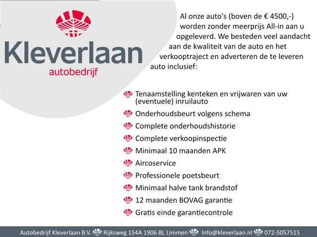 Hoewel aan de informatie van deze advertentie de grootst mogelijke zorg wordt besteed, kan Kleverlaan BV niet aansprakelijk worden gesteld voor eventuele onjuiste informatie van welke aard dan ook. Informeer bij onze verkoopadviseurs voor de exacte uitvoering en beschikbaarheid van de auto.