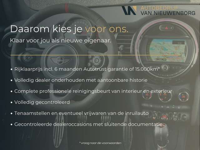 Binnenkort in voorraad deze sportieve MINI Cooper S 178pk met John Cooper Works JCW-Trim exterieur- en interieurpakket. Voorzien van de sportieve JCW-accenten zoals JCW voor- en achterbumper met hoogglans diffuser, 18 inch JCW Circuit Spoke 901 lichtmetalen velgen en JCW Sport/Kuipstoelen. Auto is afkomstig van de eerste eigenaar, schadevrij zonder ongevalsverleden en volledig aantoonbaar BMW/MINI dealer onderhouden. Dak en spiegelkappen meegespoten in de exterieurkleur Midnight Black metallic. Deze kleur geeft een elegante maar tegelijkertijd sportieve uitstraling. Verder voorzien van vele opties zoals Panoramadak, Keyless Entry & Start, Achteruitrijcamera met Parkeersensoren voor en achter, Adaptive Cruise Control, Head-Up Display, HiFi Upgrade geluidssysteem, Elektrisch inklapbare buitenspiegels, Stoelverwarming, Stuurwiel uitgevoerd in Nappa leder en verwarmbaar, Apple Carplay & Android Auto, Adaptive LED koplampen en nog veel meer.Onderstaand de volledige optielijst af fabriek: