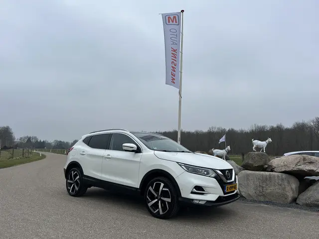 Origineel Nederlands geleverde Nissan Qashqai 1.3 DIG-T benzine SUV afkomstig van de eerste eigenaar. Onderhoudshistorie en de NAP Nationale auto pas zijn aanwezig. Rijk uitgeruste TEKNA uitvoering in de kleur wit metallic met panorama dak, 360 graden camera, LED verlichting, navigatiesysteem, adaptieve cruise control, half lederen bekleding, verwarmde voorstoelen, keyless entry, climate control, xenon verlichting, lichtmetalen velgen, parkeersensoren voor en achter, getinte ramen, bluetooth telefoonvoorbereiding, carkit, regensensor, elektrische ramen voor en achter etc. Inruil en financiering is mogelijk bij Mensink auto. Voor meer informatie bel 0653617098 of zie de website www.mensinkauto.nlMeer informatie