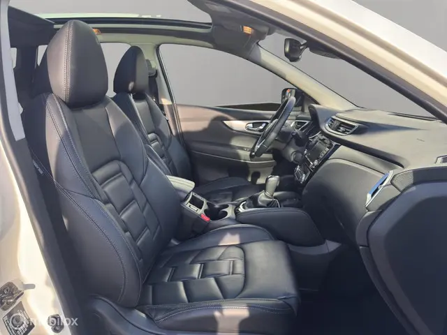 Nissan koppelt vooruitstrevende techniek aan zorgeloos rijplezier. Innovation that excites. Hij heeft een benzinemotor en een automatische transmissie. De hoogwaardige uitstraling van deze auto wordt benadrukt door de lederen bekleding. De verwarmbare voorstoelen zijn een weldaad voor rug en schouders. Ontspannen rijden begint met de juiste zit. Daar zorgen de comfortstoelen wel voor. Zicht, licht en toch dicht! Een geweldige rijervaring met het glazen panoramadak. Natuurlijk behoren 19 inch lichtmetalen velgen, LED koplampen, donker getint glas achter, in delen neerklapbare achterbank, LED-achterlichten en verstelbare lendensteunen ook tot de uitrusting van deze complete auto.