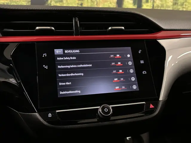 In deze auto zijn verschillende technologieën aanwezig die voor u het verkeer en de omgeving in de gaten houden en die desnoods ook kunnen remmen of bijsturen. Bij de veiligheidssystemen van deze auto hoort ook de verkeersbord-detectie. Die leest tijdens het rijden als het ware met u mee en attendeert u op de significante verkeersborden langs en boven de weg. Deze Opel Corsa is ook behulpzaam als het gaat om een rechte koers. Het Lane-keeping systeem signaleert en corrigeert als u onbedoeld de rijstrooklijnen dreigt te overschrijden. Als een fietser of andere weggebruiker zich net buiten uw zichtveld naast de auto bevindt, slaat de actieve dodehoekdetectie meteen alarm. Verder is deze auto uitgerust met forward collision warning system, hill hold functie, vermoeidheidsherkenning, autonoom remsysteem en bandenspanningcontrolesysteem.