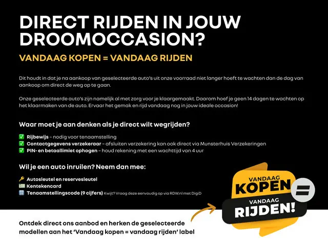Bij deze auto adverteren wij met de slogan ‘Vandaag kopen = vandaag rijden’.Deze auto hebben wij onlangs met zorg voor U klaargemaakt, waardoor U op de dag dat U de auto koopt ook met de auto kan wegrijden!