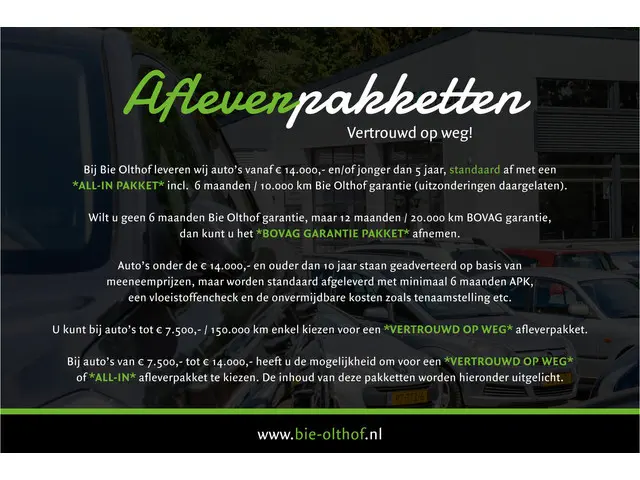 * Geen 6 maanden Bie Olthof maar 12 maanden / 20.000 BOVAG garantie? Dat kan tegen een bijbetaling van €650,-. (alleen mogelijk i.c.m. het all-in afleverpakket).