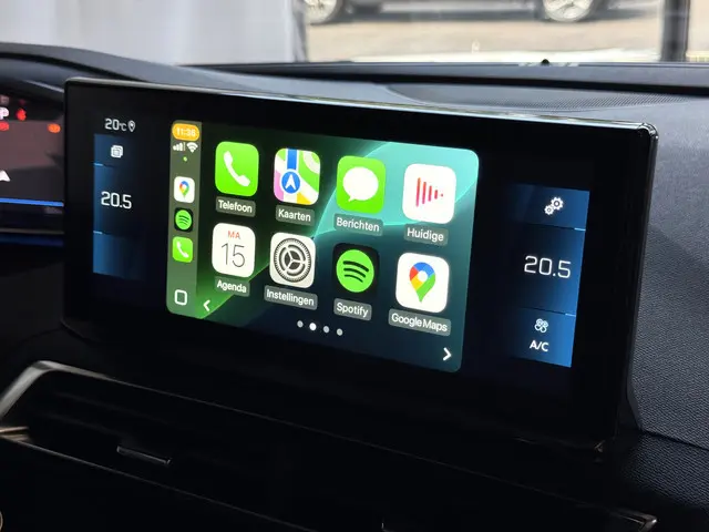 Groot centraal touchscreen met navigatie en smartphone-integratie (Apple CarPlay/Android Auto).