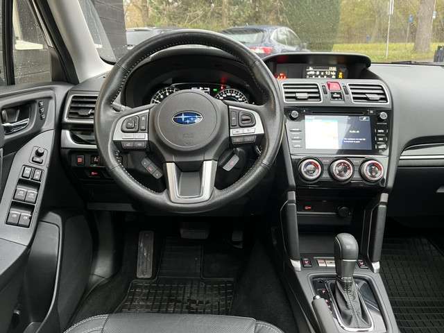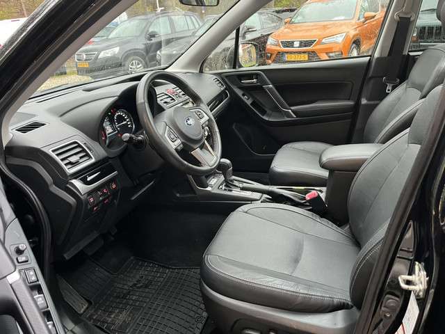 Bij het ontwerpen van de Subaru Forester stonden jouw comfort en jouw veiligheid centraal. Deze stoere auto wordt aangedreven door een benzinemotor en een automatische transmissie. Het met leer beklede interieur geeft deze auto een gedistingeerde uitstraling. Deze Subaru Forester heeft verwarmbare voorstoelen, voor zowel bestuurder als bijrijder. Life is easy! In ieder geval met dit elektrisch bediende glazen panoramadak. De achterklep opent automatisch met een druk op de knop. Handig als je met volle handen staat. Ook is de auto voorzien van: 17 inch lichtmetalen velgen, LED koplampen, dakspoiler, donker getint glas achter en in delen neerklapbare achterbank.Kinderfietsje niet gezien bij het inparkeren? Dat gebeurt je nooit meer. Daar zorgt de achteruitrijcamera wel voor! Met adaptive cruise control houdt deze auto automatisch afstand tot jouw voorligger. Tijdens de rit bedien jij het audio-installatiesysteem en het full map navigatiesysteem met de knoppen op het stuur of met je stem. De electronic climate control zorgt onder alle omstandigheden voor een prettige temperatuur. Natuurlijk is een complete auto als deze ook voorzien van sensoren die de omgeving in de gaten houden. Deze Subaru heeft niet alleen een automatisch inschakelbare verlichting aan boord, maar ook een regensensor. Met schakelpaddles aan het stuur, keyless entry, bagage afdekhoes en boordcomputer is deze auto helemaal compleet.