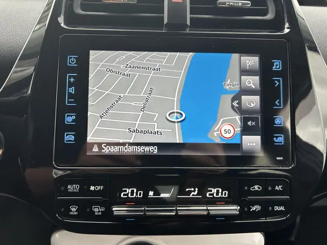 Zoals u mag verwachten van deze Toyota Prius is hij uitgerust met een reeks aan actieve veiligheidssystemen. De camera van de verkeersborddetectie herkent verschillende soorten verkeersborden en toont deze op het dashboard. Het Lane-keeping systeem garandeert dat u zich niet onverhoeds buiten de lijnen van de rijstrook begeeft. Onbedoeld bumperkleven is er niet bij, dankzij de forward collision warning. Die waarschuwt direct als een botsrisico met uw voorligger dreigt. De auto is ook uitgerust met head-up display, dodehoekdetectie, hill hold functie, brake assist en bandenspanningcontrolesysteem.
