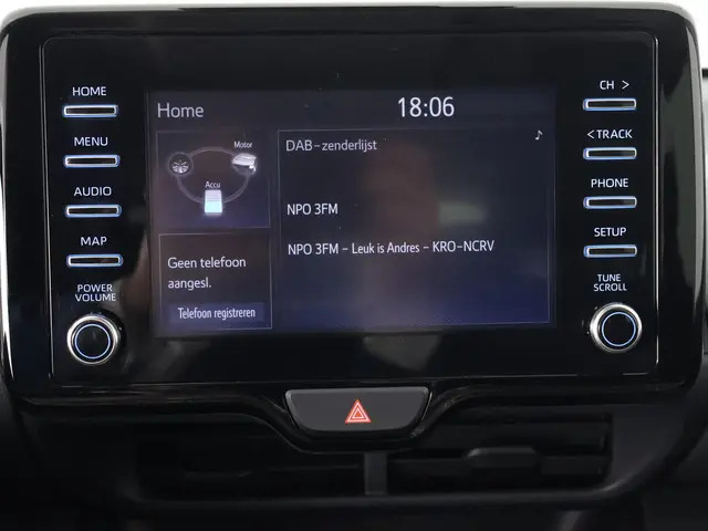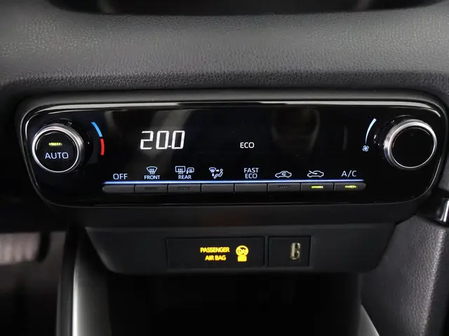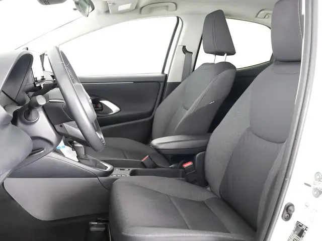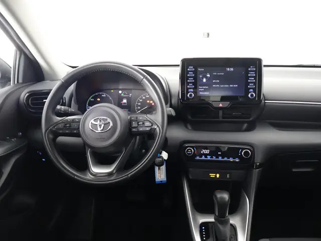 Kom maar, kom maar, kom maar... ho! Prettig hoor, zo'n achteruitrijcamera. Adaptive cruise control is veilig en comfortabel. De snelheidsregelaar houdt automatisch afstand tot het voertuig dat voor u rijdt. Deze Toyota Yaris is 'connected'. Belangrijke functies worden permanent gemeten en zijn uit te lezen via een speciale app, ook op afstand. Deze Toyota is voorzien van knoppen op het stuur om het audiosysteem met dab-ontvangst te bedienen. Of het buiten nu warm is of koud, dankzij automatische airconditioning is het binnen altijd behaaglijk. Deze Toyota is voorzien van regensensor, buitentemperatuurmeter, lederen stuur, centrale deurvergrendeling met afstandsbediening en lederen versnellingspook.